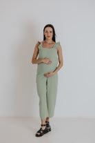 Light, airy, and effortless—this maternity-friendly jumpsuit is made from a beautifully breathable fabric that drapes softly over your body. The relaxed silhouette makes it ideal for wearing with or without a bump, while the frill detail adds a feminine touch that works for both casual days and special occasions. A go-to piece when you want maximum comfort without losing your style.