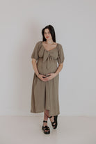 One of our best-loved styles, now available in four stunning colors. This versatile dress can be tied at the front or the back, giving you two different looks in one. Crafted from the same lightweight fabric as our frill jumpsuit, it’s designed to flatter your bump while also offering discreet breastfeeding access. Perfect as a baby shower dress, for summer outings, or as a timeless piece you’ll reach for again and again.
